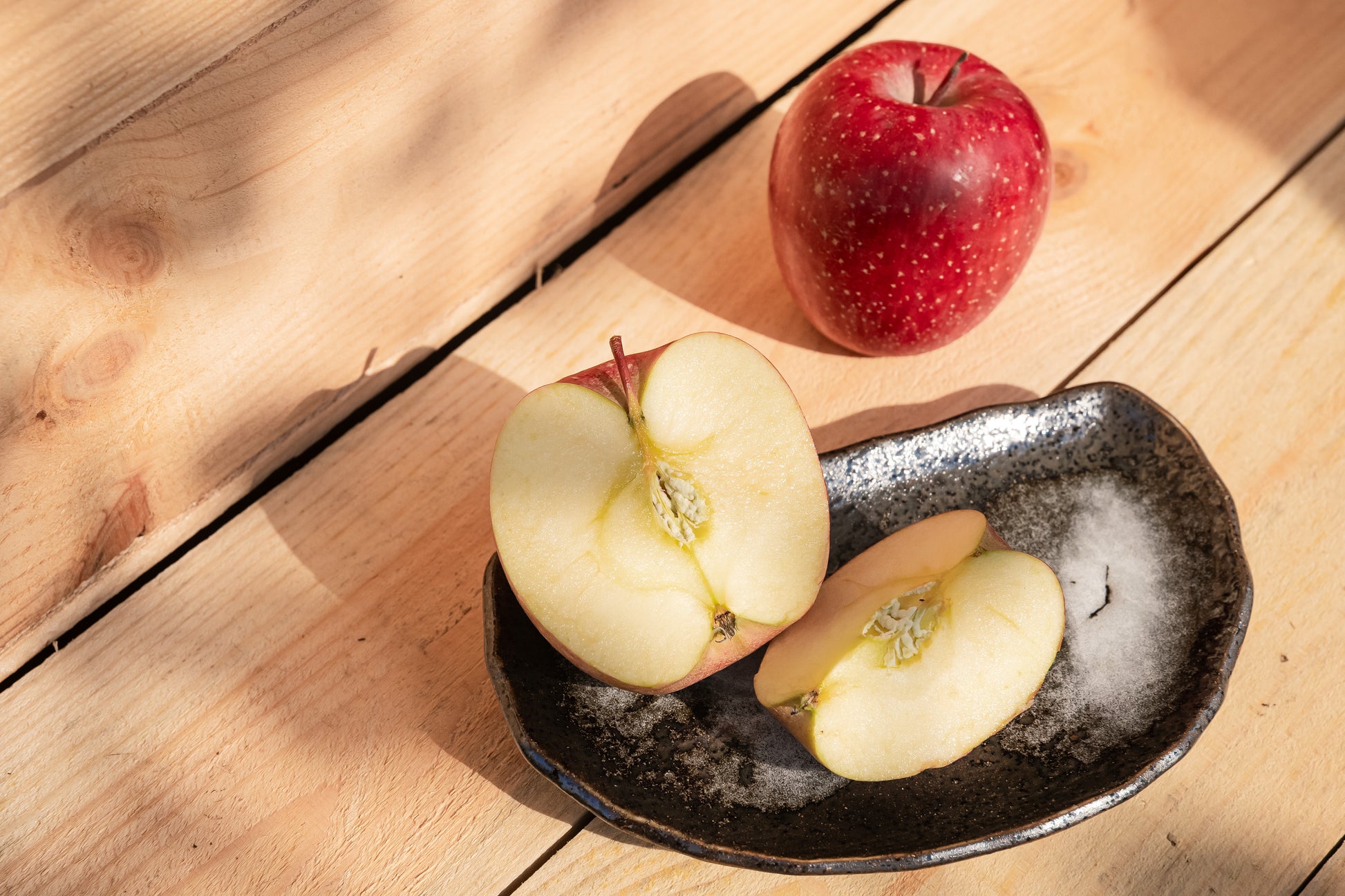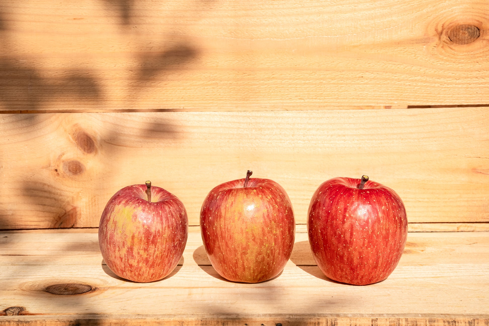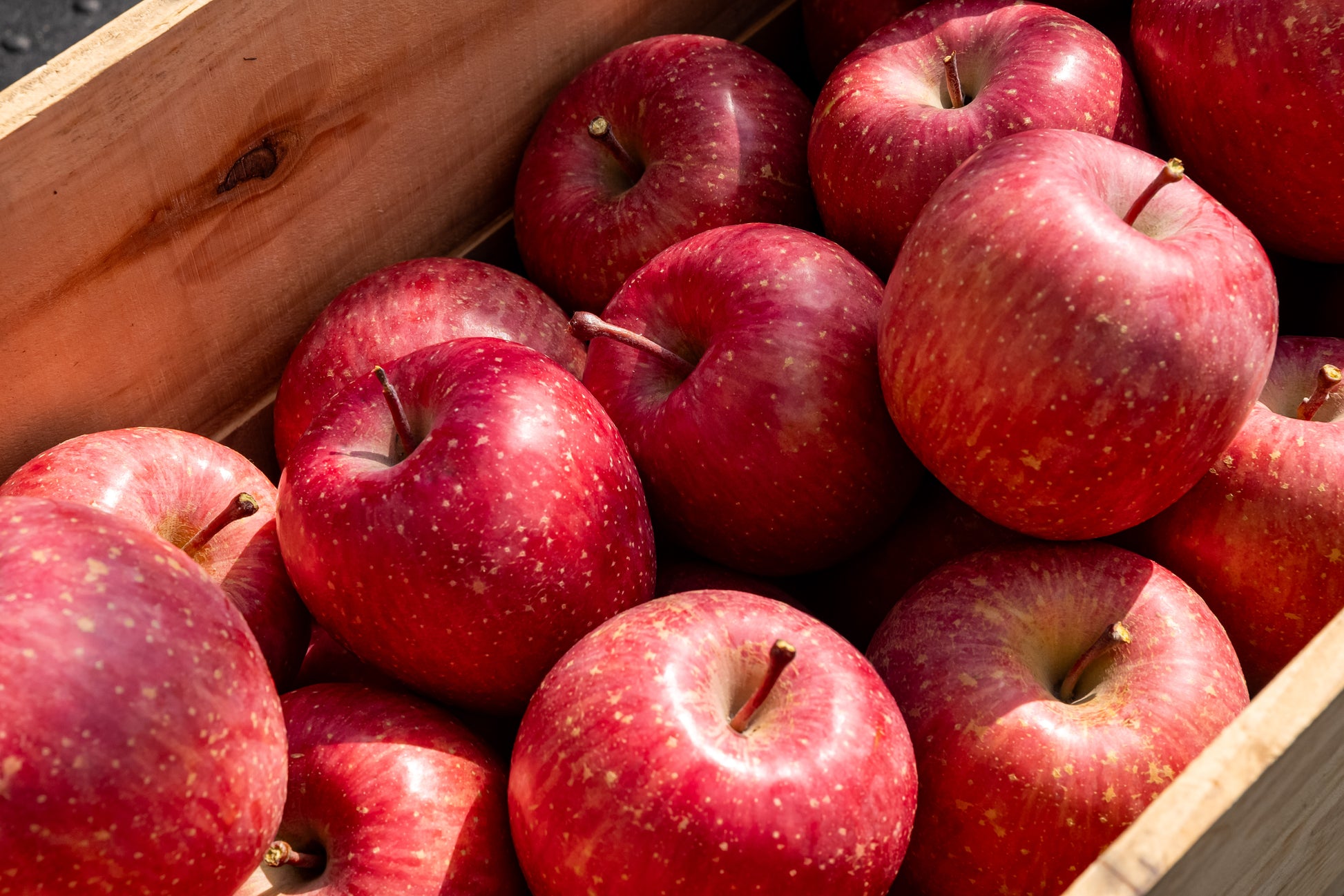 こちらは当園での家庭用りんごです。傷やサビがあったり、つるの部分に割れがあったりしていますが、味や品質には影響はありません。70年の歴史がある農園のため古い木ならではの、酸味と甘みのバランスが取れたリンゴです。硬くて歯応えが良く、シャキシャキでとてもおいしいです。